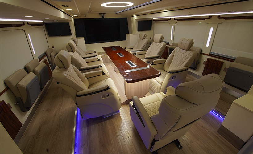 金旅最新研制的指揮車,以錦程中巴和凱歌大巴為兩個(gè)承載平臺,是面向公安系統(tǒng)客戶的不同警務(wù)工作場景定制開發(fā)的明星指揮車產(chǎn)品組合。其中,9米級錦程指揮車,外形美觀大氣,動(dòng)力強(qiáng)勁,設(shè)有視頻分析及辦公區(qū),數(shù)據(jù)分析研判區(qū),會議區(qū),配備了車載應(yīng)急指揮移動(dòng)系統(tǒng)、數(shù)據(jù)采集傳輸系統(tǒng)、通訊網(wǎng)絡(luò)系統(tǒng)、音視頻處理系統(tǒng),可以短時(shí)間內(nèi)抵達(dá)應(yīng)急現(xiàn)場,快速搭建現(xiàn)場指揮中心,實(shí)現(xiàn)現(xiàn)場通信指揮、應(yīng)急調(diào)度、信息回傳等功能,保障各類警務(wù)工作的順利進(jìn)行。而12米凱歌指揮車,承擔(dān)現(xiàn)場應(yīng)急通信指揮的中樞角色,配備了先進(jìn)的衛(wèi)星通信系統(tǒng)、專網(wǎng)通信系統(tǒng)、音視頻采集顯示系統(tǒng)、視頻會議系統(tǒng)、集中控制系統(tǒng)、網(wǎng)絡(luò)系統(tǒng)、無線通信系統(tǒng),可滿足10-20人進(jìn)行現(xiàn)場會議溝通,是一款通信指揮全能車型。