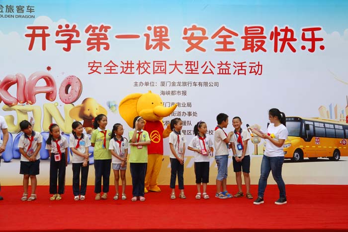在同學(xué)們的掌聲和歡呼聲中,金旅校車卡通形象“小金象”走上舞臺(tái),向同學(xué)們擺出各種可愛(ài)的姿勢(shì),許多同學(xué)伸手向“小金象”打招呼,現(xiàn)場(chǎng)充滿歡聲笑語(yǔ)。在“小金象”的帶領(lǐng)下,十名同學(xué)代表參觀了開進(jìn)學(xué)校的金旅校車,工作人員細(xì)心講解校車乘車安全,同學(xué)們聽著津津有味,還上臺(tái)與其他同學(xué)做了分享。