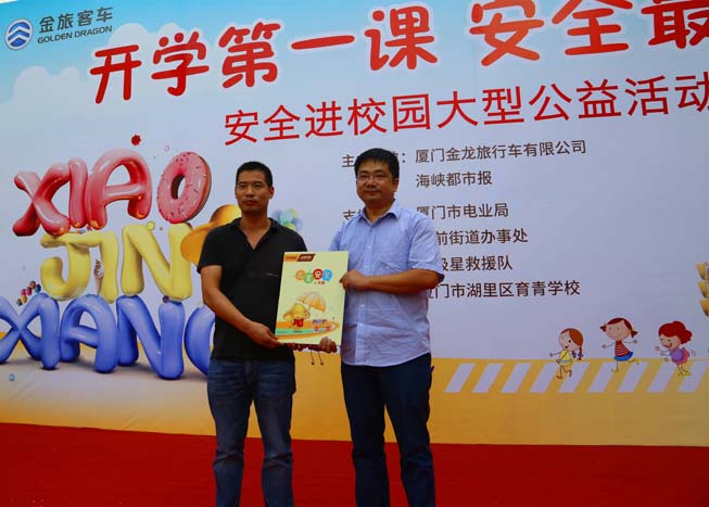 廈門金旅特別制作了《小金象兒童安全手冊(cè)》,通過(guò)漫畫的形式,讓小朋友們?cè)谟腥さ拈喿x后,學(xué)習(xí)從生活的各種細(xì)節(jié)中去注意安全。活動(dòng)的最后一環(huán)節(jié),便是贈(zèng)書儀式,廈門金旅總經(jīng)理助理、工會(huì)主席王立志將安全手冊(cè)送到廈門市湖里區(qū)育青學(xué)校校長(zhǎng)楊軍的手中,臺(tái)下掌聲雷動(dòng),獲得好評(píng)。此外,廈門市電業(yè)局也帶來(lái)了用電安全手冊(cè),并贈(zèng)給了學(xué)校。