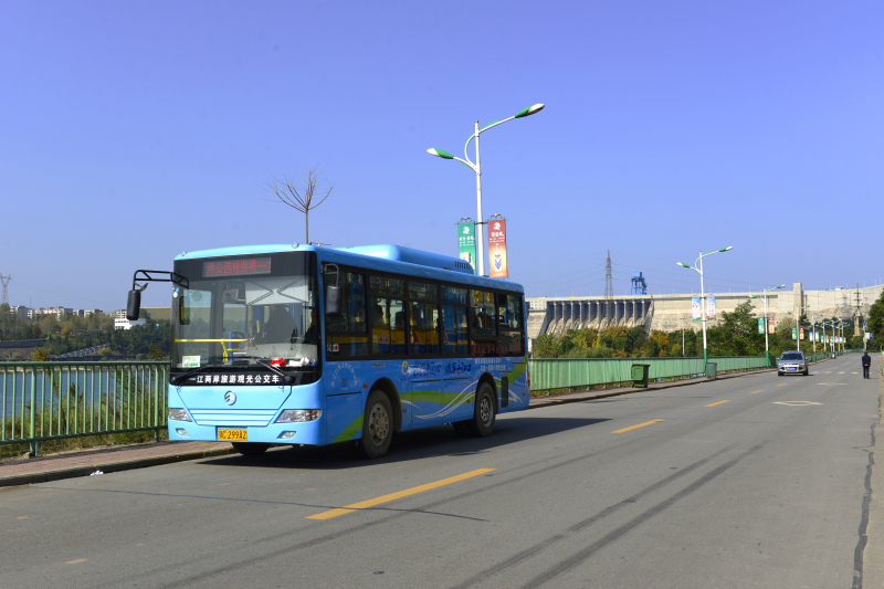 行駛在丹江口水庫大壩前的廈門金旅純電動公交車