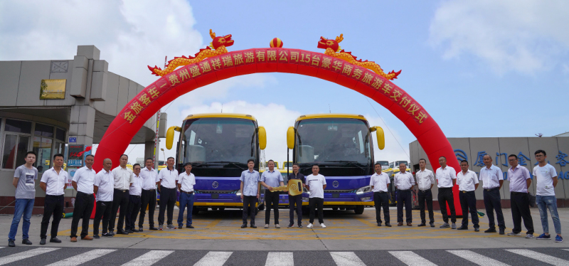 2020年7月9日,金旅客車15輛定制版豪華商務(wù)旅游車交付貴州盛通祥瑞旅游有限公司(以下簡稱“盛通祥瑞”),為當(dāng)?shù)馗叨寺糜?、團(tuán)體接待等提供出行服務(wù)。盛通祥瑞總經(jīng)理徐維一行到廈出席了交車儀式。