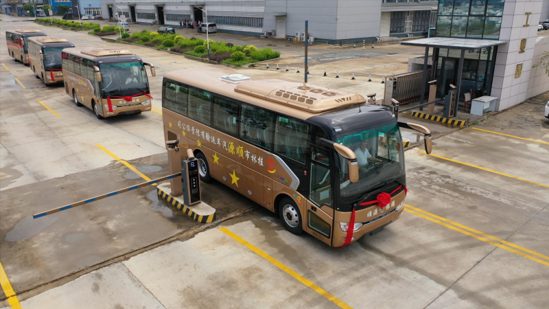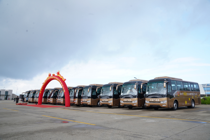 7月3日上午,廈門金龍旅行車有限公司(以下簡稱“金旅”)龍池生產(chǎn)基地正舉行著一場交接車儀式,天氣時雨時晴,但絲毫不影響接車客人喜悅興奮的心情。儀式現(xiàn)場喜氣洋洋,16輛車頭戴著大紅花的金旅客車正式交付桂林市順源汽車運輸有限責任公司(以下簡稱“順源汽運”)。該批車輛由12輛金旅錦程中巴和4輛金旅凱歌大巴組成,是金旅針對旅游市場高端化、品質化的最新出行需求,應用全新科技和領先工藝打造的拳頭產(chǎn)品,備受旅游市場青睞。