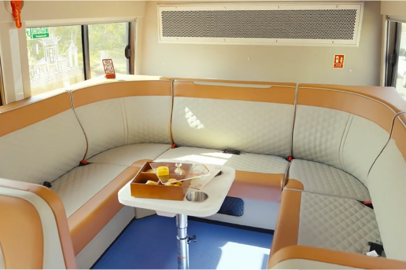 粉嫩的“雙層觀光巴士”,擁有全景天窗、KTV影音系統(tǒng)、氛圍燈及車身燈帶等多項(xiàng)豪華配置。一層車內(nèi)頂棚印有泉州特色景點(diǎn)老君巖和東西塔的圖案,二層的窗戶玻璃里刻有十幅世遺景點(diǎn)圖,整車處處體現(xiàn)泉州經(jīng)典印記。