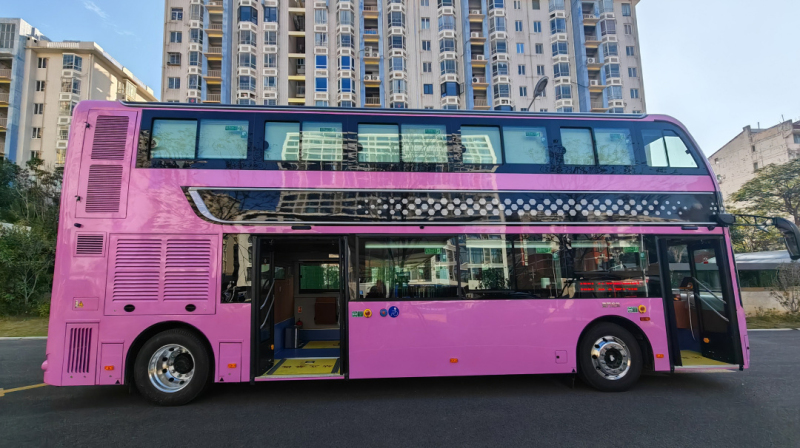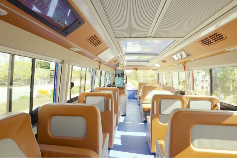 金旅北極星家族化前臉搭配精致璀璨LED大燈,彰顯科技時(shí)尚;粉紅色的車身和兩側(cè)大幅觀景窗相得益彰,顏值滿滿。車輛采用一級踏步低地板結(jié)構(gòu),乘客可一步登乘,車廂內(nèi)空間寬敞,乘客一層站立不碰頭、二層行走舒適方便。內(nèi)部空間設(shè)計(jì)上,豪華科技風(fēng)格與“海絲名城”的城市定位更相配。車內(nèi)設(shè)計(jì)了大量軟包處理,最大程度呵護(hù)乘客安全。進(jìn)口木紋地板革、高靠背豪華軟座、吧臺、無線充電器、多彩氛圍燈、車載點(diǎn)歌系統(tǒng)、巨幅全景天窗,一切都是那么“高大上”。此外,到站提醒及景區(qū)風(fēng)光介紹的高清大屏,帶杯架獨(dú)立辦公桌,車內(nèi)專設(shè)無障礙乘車設(shè)施和輪椅區(qū)以及愛心專座,極大提升乘坐舒適體驗(yàn)。