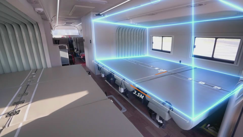 金旅應(yīng)急救援宿營車采用成熟的大型客車平臺(tái)改制,車長11米,配備大馬力柴油發(fā)動(dòng)機(jī),動(dòng)力強(qiáng)勁,可以最短時(shí)間到達(dá)指定地點(diǎn)展開工作。車輛為25 + 1的座位設(shè)計(jì),座椅坐臥兩用,既能滿足人員乘坐需求,又可展開成為通鋪用于休息,還能作為臨時(shí)辦公開會(huì)的場(chǎng)所,功能十分多樣。車身配備的方艙拓展系統(tǒng),具備一鍵伸縮功能,且伸縮在35秒以內(nèi)即可完成。在方艙向車身兩側(cè)展開后,伸出長度可達(dá)95厘米,同時(shí)將座椅靠背翻轉(zhuǎn)成床,就可形成長度達(dá)3.5米,寬度2米的通鋪,一張通鋪可睡3 - 5個(gè)人,整車能夠容納二十幾人休息,充分保障了救援隊(duì)伍的休息需求,確保救援人員能以飽滿的精神狀態(tài)投入到搶險(xiǎn)救災(zāi)工作中。
