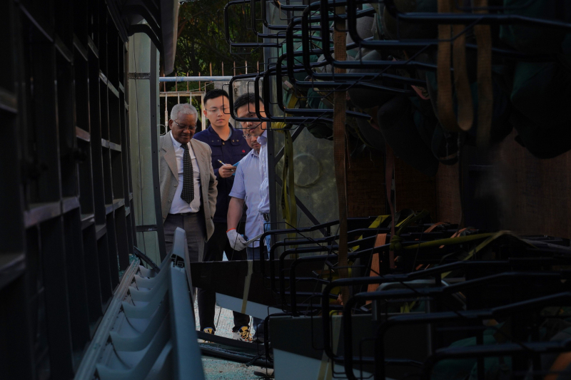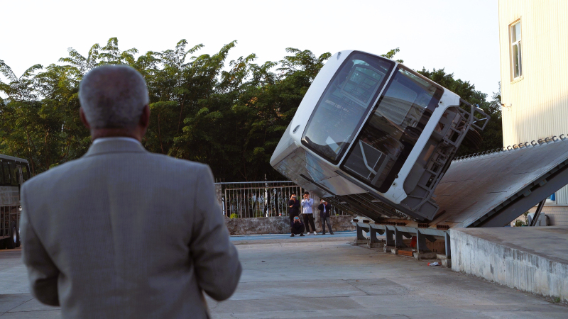 下午3時,在金旅側(cè)翻試驗臺前,Clive Chirwa教授與金旅工程師團隊一同屏息凝神,觀看試驗的進行。此次側(cè)翻試驗旨在模擬車輛在極端側(cè)翻情況下,車身結(jié)構(gòu)對乘員的安全保護能力,是檢驗客車被動安全性的關(guān)鍵環(huán)節(jié)。