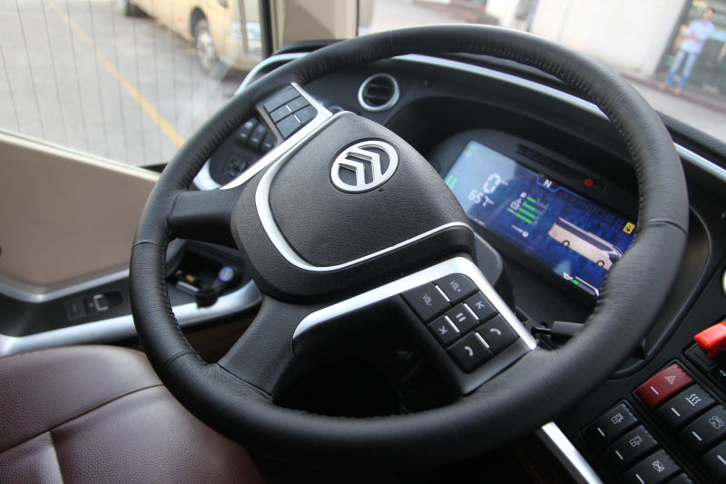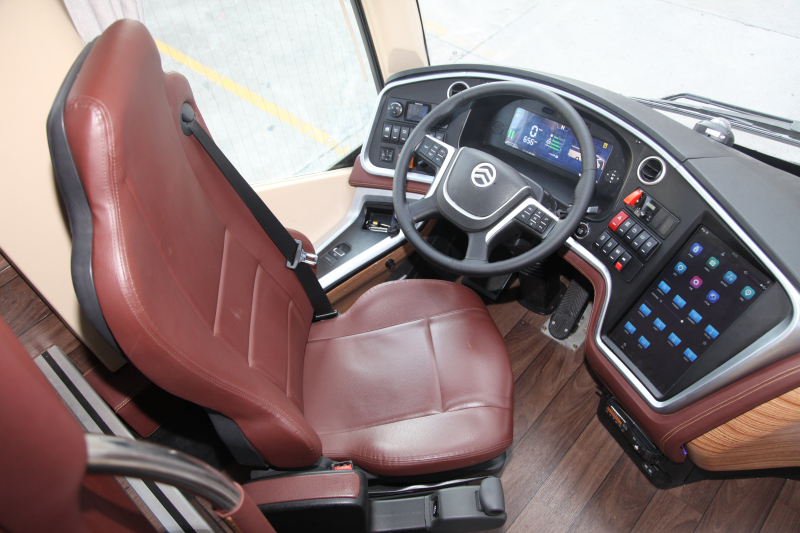 作為試駕者,我最先關注的是駕駛區(qū)設計。當看到一部已經(jīng)旋轉好45°等待迎接駕駛者進入的座椅時,估計很多駕駛者會如我一樣被這種貼心的設計所打動。由于客車以乘客滿意度為主要衡量指標,國內客車產(chǎn)品的設計者會把更多精力放在乘客區(qū),普遍存在著對駕駛區(qū)關注度不夠的問題。但事實上,駕駛員的工作狀態(tài)對一輛客車的安全性、經(jīng)濟性和舒適性有著至關重要的影響。從領航者身上我們看到了國內客車在駕駛區(qū)設計理念上的改變,除了一款舒適可旋轉的空氣懸浮座椅,AMT變速器、一鍵啟動裝置、電動車窗及后視鏡調節(jié)、電動遮陽簾、電子駐車制動等自動化配置,都會讓駕駛者像駕駛一輛家用車那樣輕松。