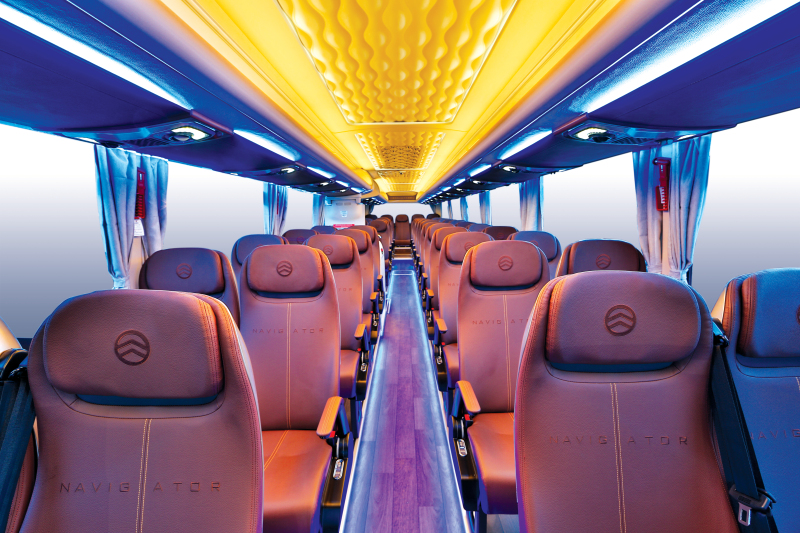 我對領航者的內飾包括座椅、側圍、頂部、過道等各部分進行了仔細觀摩,很難說出哪里最突出和特別,但卻不得不承認它帶來了國產(chǎn)客車前所未有的感受。正如設計師所說,他們在設計時更加考慮整體感,將每一個部分的細節(jié)都處理好,以形成溫暖和人性化的主體風格。例如,入口區(qū)設計從視覺上區(qū)分了駕駛區(qū)和乘客區(qū)的通道,很好地為乘客區(qū)營造了私密的感覺;真皮縫制的棕色座椅與仿木制地板革,低調而奢華;車廂頂部波紋形狀的裝飾板,在行李架兩側燈帶的交相輝映下,營造出設計師所說的劇場效果。