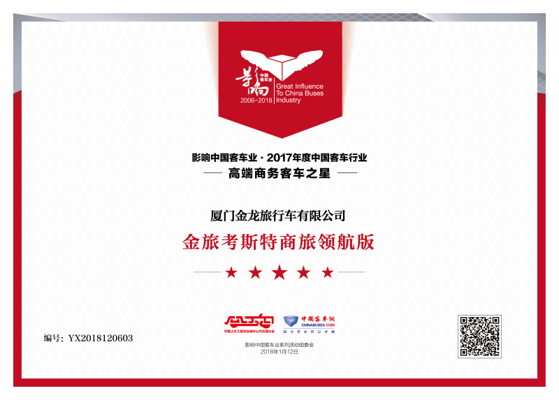 影響是一種持續(xù)的力量,每一年的中國客車業(yè),總有一些人、一些事兒影響著行業(yè)前行。2018年1月12日,第12屆影響中國客車業(yè)系列活動(dòng)在北京新世界酒店隆重舉行。行業(yè)專家、學(xué)會(huì)代表、客車企業(yè)、公交客運(yùn)、技術(shù)配套等近百家單位齊聚一堂,共同見證了這一行業(yè)盛會(huì)。活動(dòng)當(dāng)晚,“第12屆影響中國客車業(yè)年度盤點(diǎn)活動(dòng)”評(píng)選結(jié)果正式揭曉,金旅客車榮獲“2017年度高端旅游客車之星”和“2017年度高端商務(wù)客車之星”兩項(xiàng)大獎(jiǎng),展現(xiàn)了金旅在高端客車市場(chǎng)的絕對(duì)優(yōu)勢(shì)。