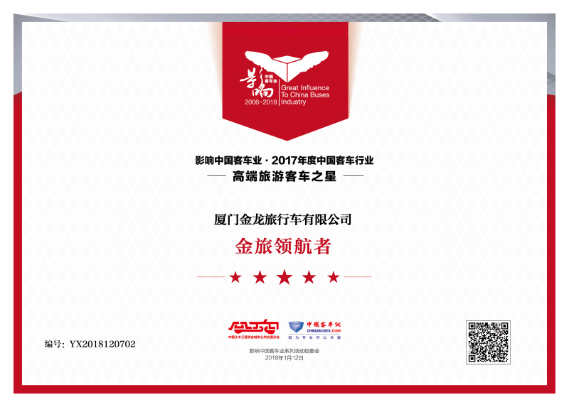 金旅領(lǐng)航者強(qiáng)摘“2017年度高端旅游客車之星”