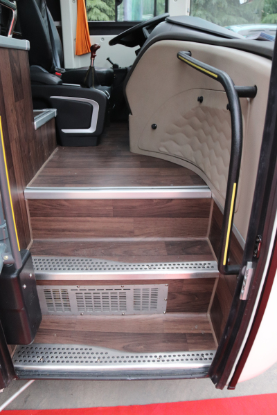 從登車(chē)入口處開(kāi)始就能感受到與原有產(chǎn)品的不同,仿木紋地板革包裹的臺(tái)階做了防滑處理,從視覺(jué)和實(shí)際感受上會(huì)給乘客帶來(lái)貼心和穩(wěn)重感。在乘客視線可及范圍內(nèi),盡量都采用軟化和啞光處理,減少金屬帶來(lái)的冰冷和刺目感。在乘客與駕駛區(qū)等分區(qū)隔斷處理上,雖不如領(lǐng)航者那樣繁復(fù),但簡(jiǎn)潔的材料和處理方式起到了類似的效果。